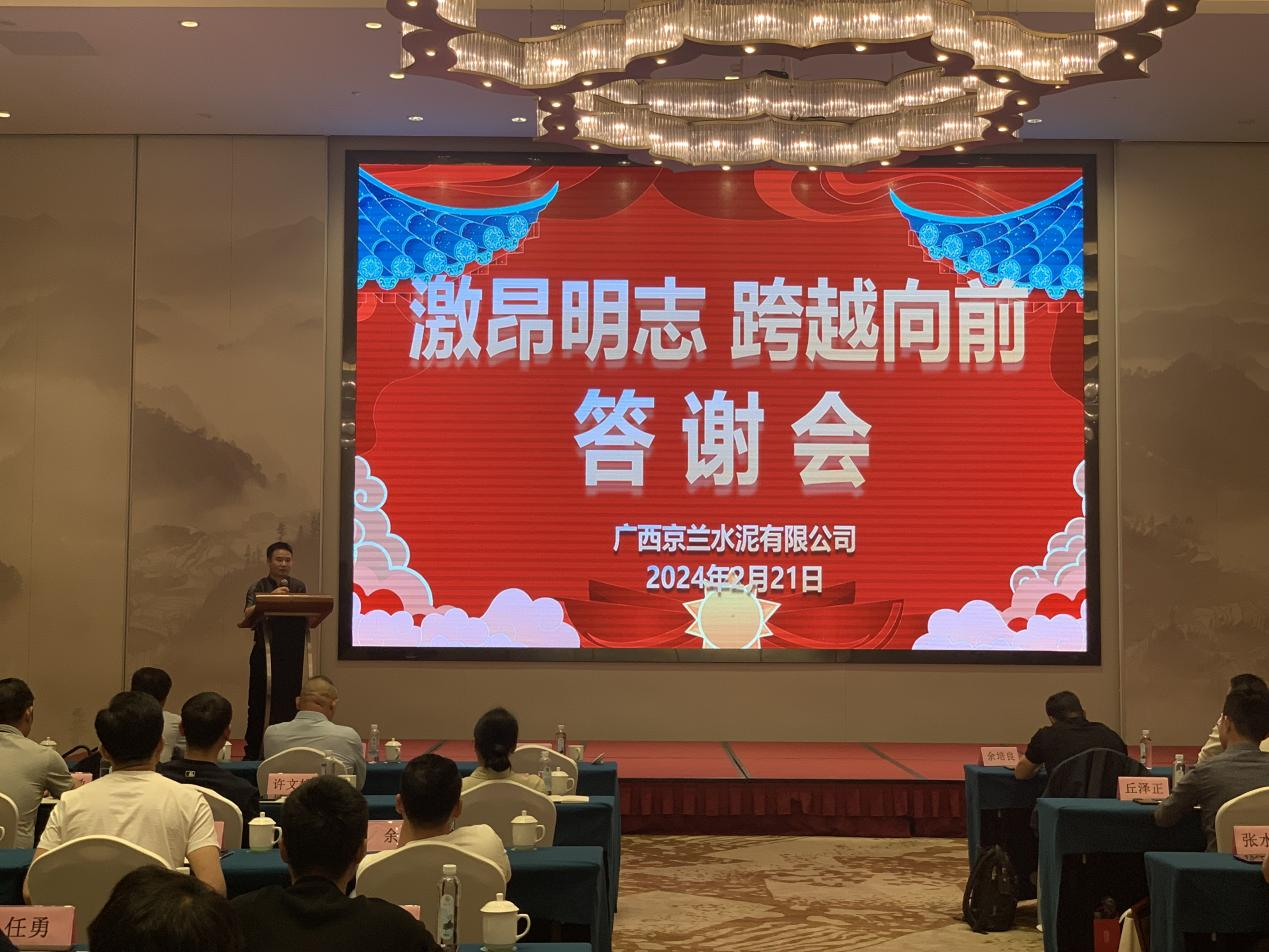2024年2月21日,广西京兰水泥有限公司在柳州莲花山庄召开以“激昂明志,跨越向前”为主题的2023年度代理商年终总结大会暨答谢会,共有来自两广各地近20个地市、40余位合作代理商参加了本次盛会,会议在热情洋溢的氛围中成功举办。